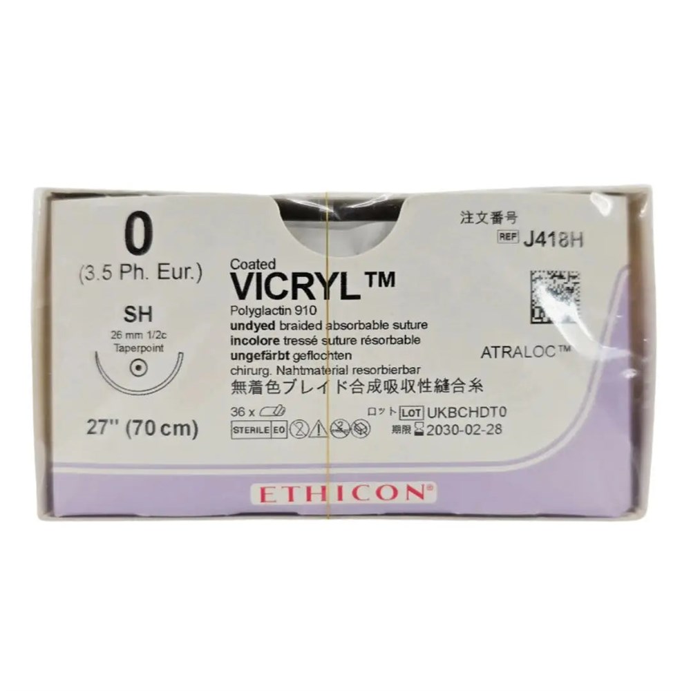 The needle included with the J418H is an SH ½-circle taper point, measuring 26 mm. The taper point design allows gradual penetration of tissue with reduced cutting action, which is advantageous in delicate or friable tissues where minimizing trauma is critical. As a braided, coated suture, it balances pliability and strength, making it suitable for a broad range of soft tissue surgeries where absorbable support over the healing period is needed.