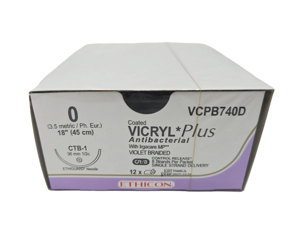 Each box contains 12 individually packaged sutures, ensuring sterile conditions for every use. The Ethicon VCPB740D is well-suited for soft tissue approximation and ligation, excluding cardiovascular and neurologic tissues. It balances strength, pliability, and safety, making it a dependable solution in both hospital and surgical center environments.